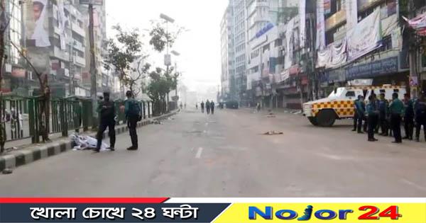 বিএনপির কেন্দ্রীয় কার্যালয়ের সামনের রাস্তার ২ পাশে ব্যবসা প্রতিষ্ঠান বন্ধ আছে।