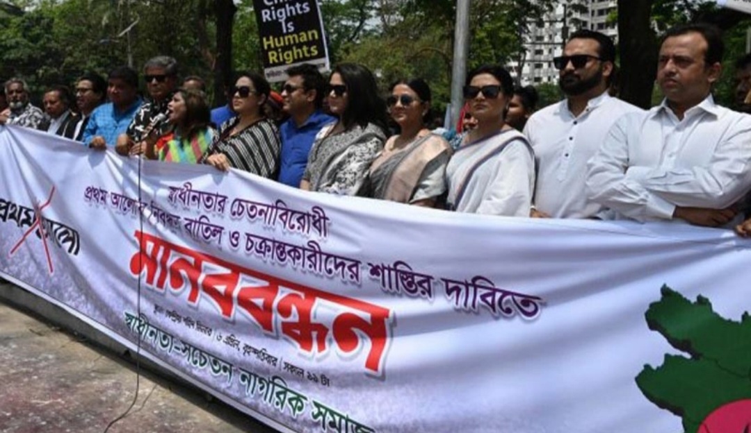 কেন্দ্রীয় শহীদ মিনারে বৃহস্পতিবার দুপুরে ‘স্বাধীনতা-সচেতন নাগরিক সমাজ’-এর ব্যানারে এ মানববন্ধনের আয়োজন করা হয়।