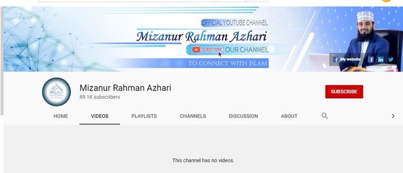 অবশেষে “Mizanur Rahman Azhari” নামে আমার অফিসিয়াল ইউটিউব চ্যানেলটি ক্রিয়েট করা হলো। আমার ফেইসবুক পেইজের নামের সাথে হুবহু মিল রেখেই, ইউটিউব চ্যানেলটির নামকরণ করা হয়েছে। সাবস্ক্রাইব করে রাখুন এবং শেয়ার করুন। ধন্যবাদ।