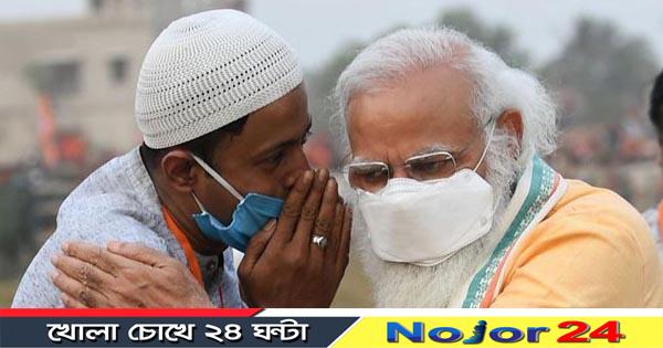 আন্তর্জাতিক ডেস্ক- মাথায় টুপি পরা এক ব্যক্তি ভারতীয় প্রধানমন্ত্রীর কানে কানে যেনো কিছু বলছেন, এমন একটি ছবি সামাজিক যোগাযোগমাধ্যমে বিপুলভাবে ছড়িয়ে পড়েছে। ভারতের প্রধানমন্ত্রী নরেন্দ্র মোদির সাম্প্রতিক পশ্চিমবঙ্গে নির্বাচনী প্রচারণার ছবিটি নিয়ে সামাজিক মাধ্যমে বিভিন্ন মিম ছড়িয়ে পড়েছে।