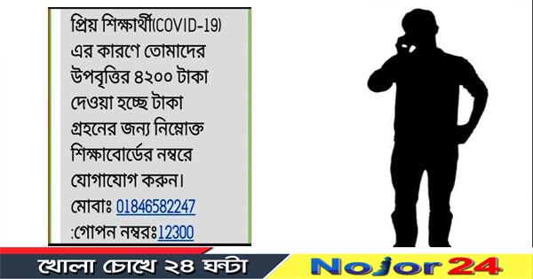 মেসেজে উল্লেখ করা হয়, ‘প্রিয় শিক্ষার্থী (COVID-19)-এর কারণে উপবৃত্তির ৪২০০ টাকা দেওয়া হচ্ছে। টাকা গ্রহণের জন্য নিম্নোক্ত শিক্ষাবোর্ডের নম্বরে যোগাযোগ করুন। মোবা: ০১৮৪৬৫৮২২৪৭, গোপন নম্বর: ১২৩০০।