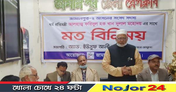 নজর২৪, জামালপুর- ধর্ম প্রতিমন্ত্রী মোঃ ফরিদুল হক খান বলেছেন, প্রধানমন্ত্রী শেখ হাসিনার দিক নির্দেশনা অনুসরণ করে দেশের মানুষের কল্যাণে নিষ্ঠা ও সততার সাথে দায়িত্ব পালনের চেষ্টা করছি। প্রধানমন্ত্রীর নেতৃত্বে দেশের মানুষের ভাগ্যের উন্নয়ন তথা বঙ্গবন্ধুর স্বপ্নের সোনার বাংলা গড়ার যে সুযোগ পেয়েছি, তা যেন সঠিকভাবে করে যেতে পারি তার জন্য সাংবাদিকসহ সকলের সহযোগিতা চাই।