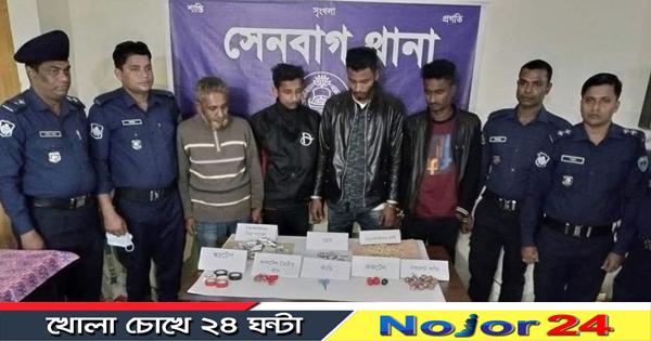 গ্রেফতারকৃতরা হলো, উপজেলার ৪নং কাদরা ইউনিয়নের উত্তর জয়নগর গ্রামের বেচু মিয়ার ছেলে আবির হোসেন (২৯) একই ইউনিয়নের মহুয়া গ্রামের মো.জাফর উল্যার ছেলে রাকিবুল ইসলাম (২৫)মফিজ উল্যার ছেলে আহমেদ পারভেজ (৩৫) মো.শহীদ উল্যাহ (৫৫)।