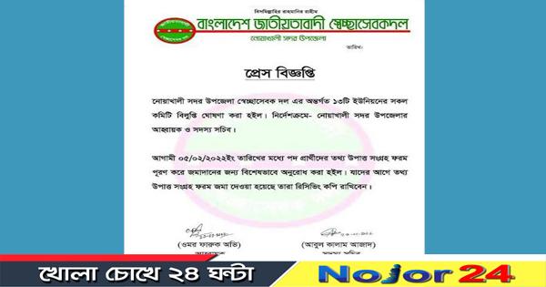 বিজ্ঞপ্তিতে আরো বলা হয়, নোয়াখালী সদর উপজেলা স্বেচ্ছাসেবকদলের অন্তর্গত ১৩টি ইউনিয়নের সকল কমিটি বিলুপ্ত ঘোষণা করা হয়েছে। একই সাথে আগামী ৫ ফেব্রুয়ারির মধ্যে পদ প্রার্থীদের তথ্য উপাত্ত সংগ্রহ ফরম পূরণ করে জমা দেওয়ার জন্য বলা হয়েছে।