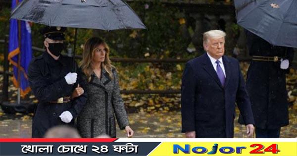 তাদের থেকে বেশ কিছুটা দূরে একা দাঁড়িয়ে প্রেসিডেন্ট ডোনাল্ড ট্রাম্প। নির্বাচন হারার পর ওই দিনই প্রথম জনসমক্ষে দেখা গিয়েছিল ট্রাম্প দম্পতিকে। কয়েকদিন আগেই কোভিড থেকে সেরা ওঠা ট্রাম্প বা মেলানিয়া দু’জনের কারও মুখেই অবশ্য মাস্ক ছিল না।